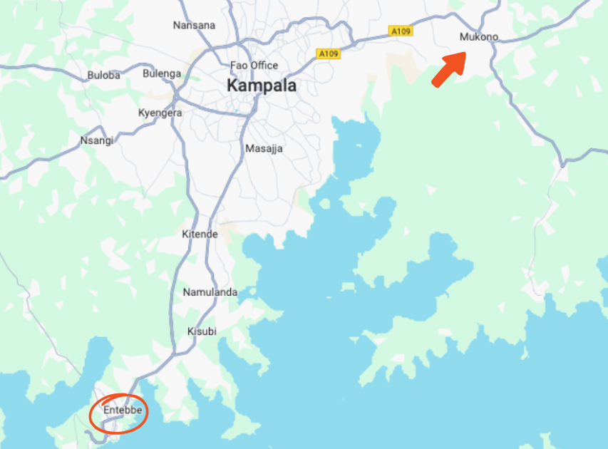 Linksonder op de kaart ziet u Entebbe, daar is het internationale vliegveld van Uganda.